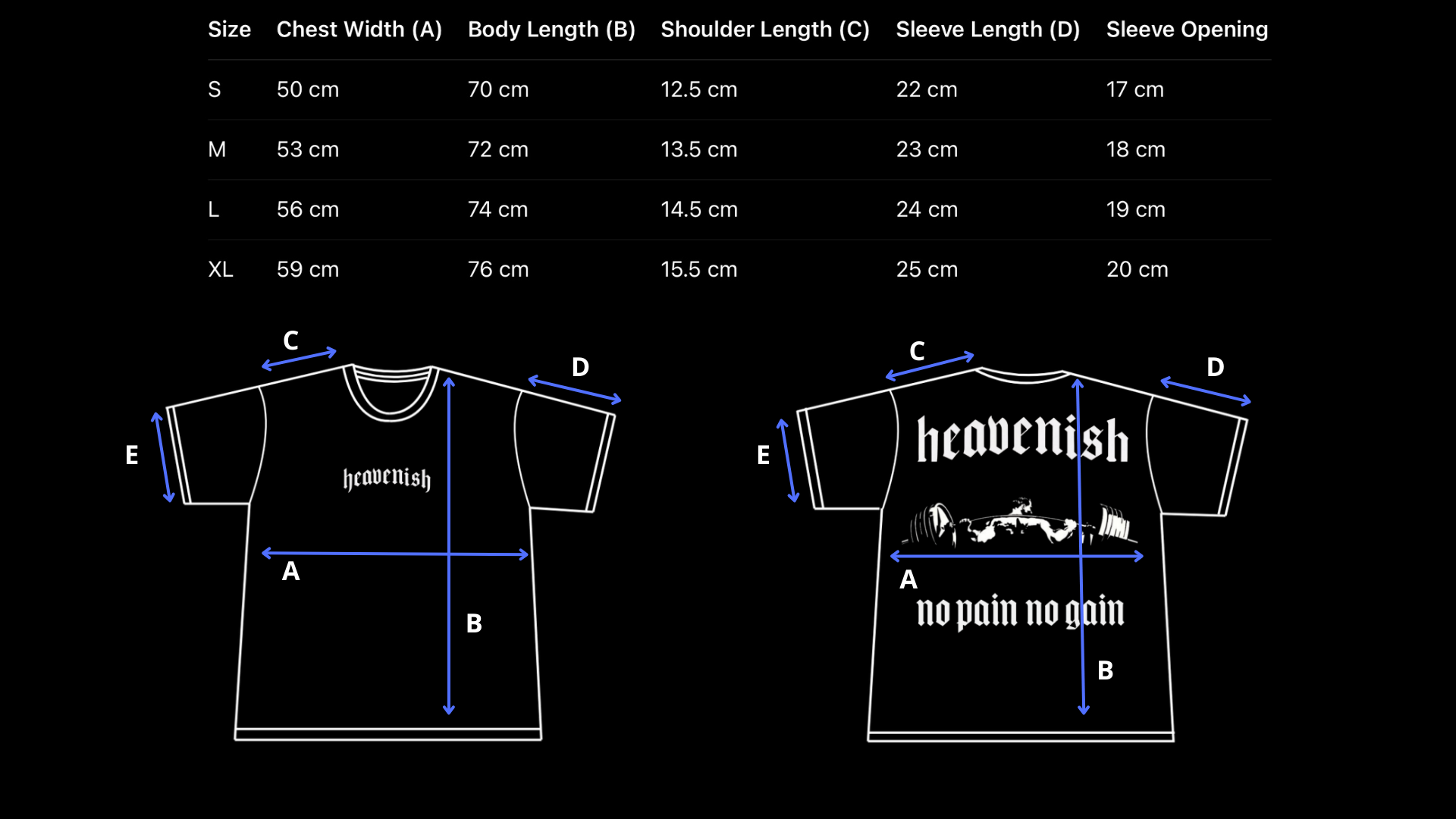 El frontal presenta un logo minimalista de HEAVENISH centrado en el pecho, mientras que la espalda incorpora un diseño contundente con la identidad de HEAVENISH, una ilustración de una barra con discos y el mensaje “No Pain No Gain” — una mentalidad, no un eslogan.